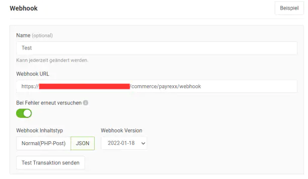 - Die Webhook URL ist mit der Endung …/commerce/payrexx/webhook auszufüllen. Der Webhook Type ist auf JSON und als Version 2022-01-18 zu setzen.