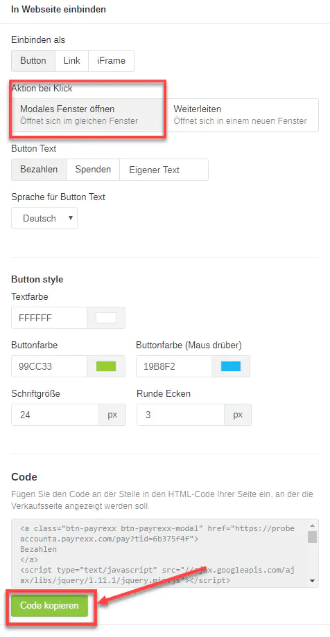 Wenn Sie Ihre Verkaufsseite als Button via modales Fenster veröffentlichen möchten, kopieren Sie den untenstehenden Code (ohne etwas an der Konfiguration zu ändern).