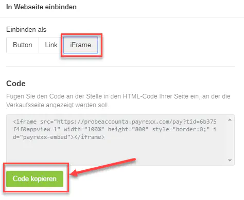 Falls Sie die Verkaufsseite als iFrame veröffentlichen möchten und nicht als Button, wählen Sie unter «Einbinden als» die Option «iFrame». Kopieren Sie anschliessend den untenstehenden Code.