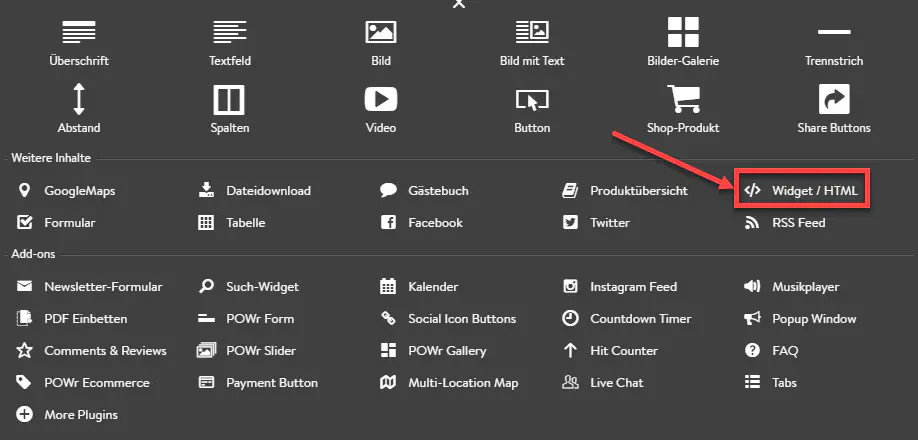Sollten die Ladezeiten für diesen Button zu lange sein oder sollten Sie die Integration via iFrame wählen. Klicken Sie statt auf Payment Button auf «Widget/HTML» und fügen Sie dort Ihren Code ein.