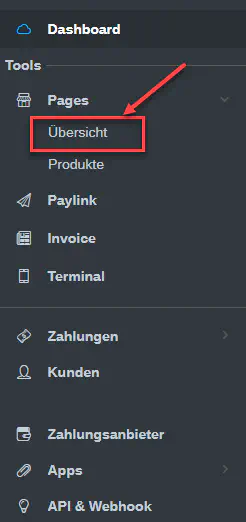 Wählen Sie in Ihrem Payrexx Dashboard «Pages» und dann «Übersicht» aus.