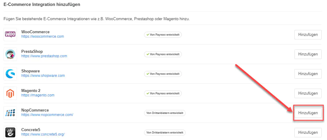 Fügen Sie nun unter «E-Commerce Integration hinzufügen» NopCommerce hinzu.