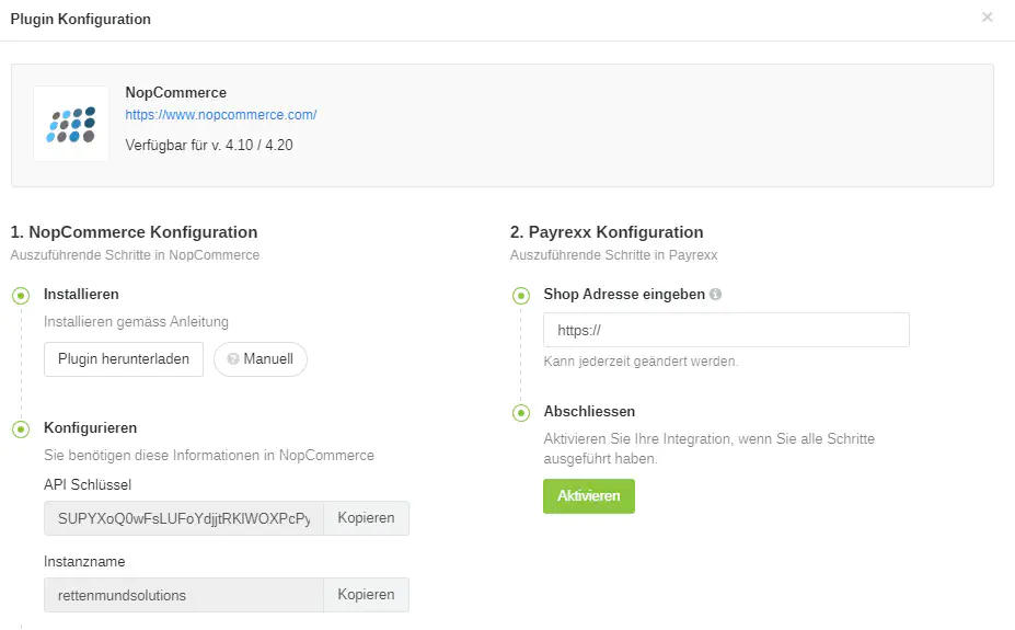 Füllen Sie bei den Plugin Konfigurationen unter «Shop Adresse» Ihre Shop Adresse ein. Unter «Konfigurieren» finden Sie nun auch der bei NopCommerce benötigte API Schlüssel und den Instanznamen.