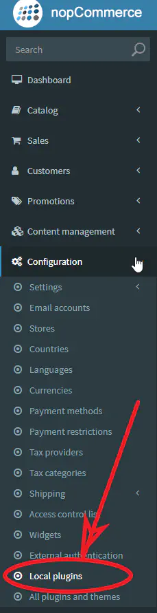 Gehen Sie in Ihrem NopCommerce Account in der linken Navigationsleiste auf «Configuration > Local plugins».