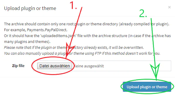 Wählen Sie oben rechts den äussersten grünen Button «Upload plugin or theme».