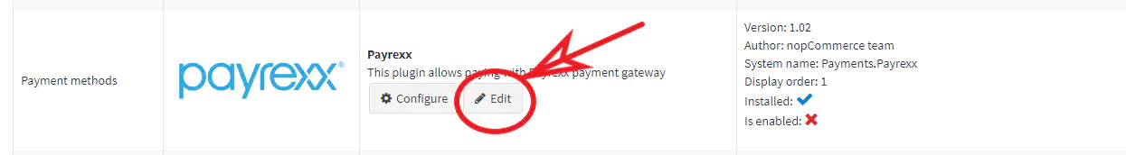 Wählen Sie hier das Payrexx Plugin aus und klicken auf «Edit» (beim Stift Symbol).