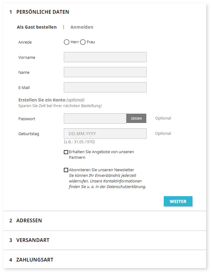 3) Der Kunde gibt seine persönlichen Daten an und wählt die Versandart: