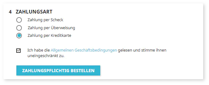 4) Schliesslich gelangt er zum Abschnitt «Zahlungsart». Dort wählt er dann «Zahlung per Kreditkarte» und schliesslich «Zahlungspflichtig bestellen»: