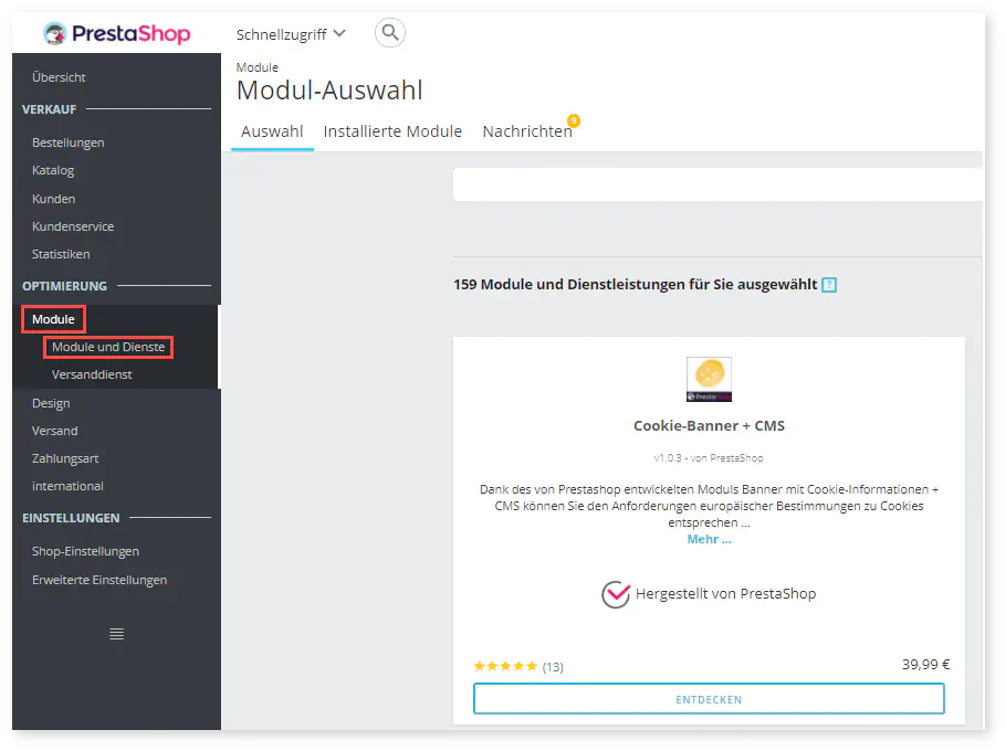 Loggen sie sich in Ihren Prestashop Account ein und navigieren Sie zu «Module > Module und Dienste»:
