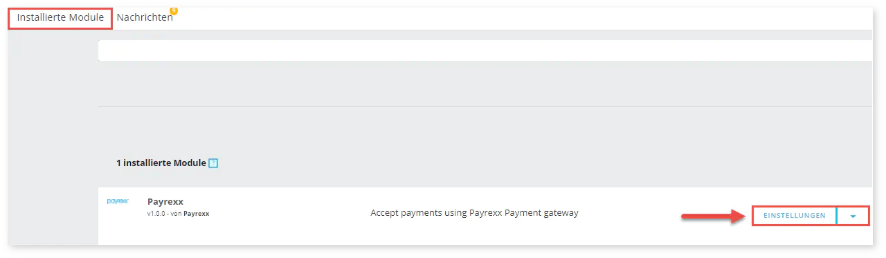 Konfigurieren Sie das Modul, indem sie zu «Module > Module und Dienste > Installierte Module» navigieren. Dort sollte das Payrexx Gateway nun angezeigt werden. Wählen Sie «Einstellungen».