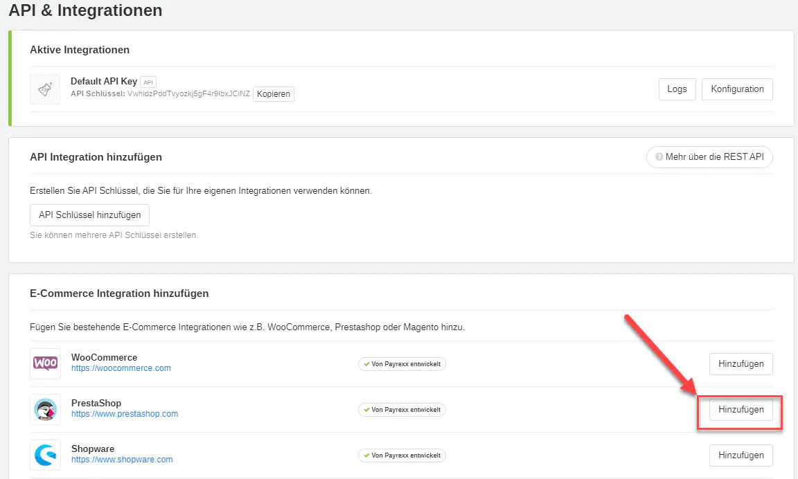 Hier können Sie nun Prestashop hinzufügen. Wählen Sie hierzu unter «E-Commerce Integration hinzufügen» Prestashop aus.