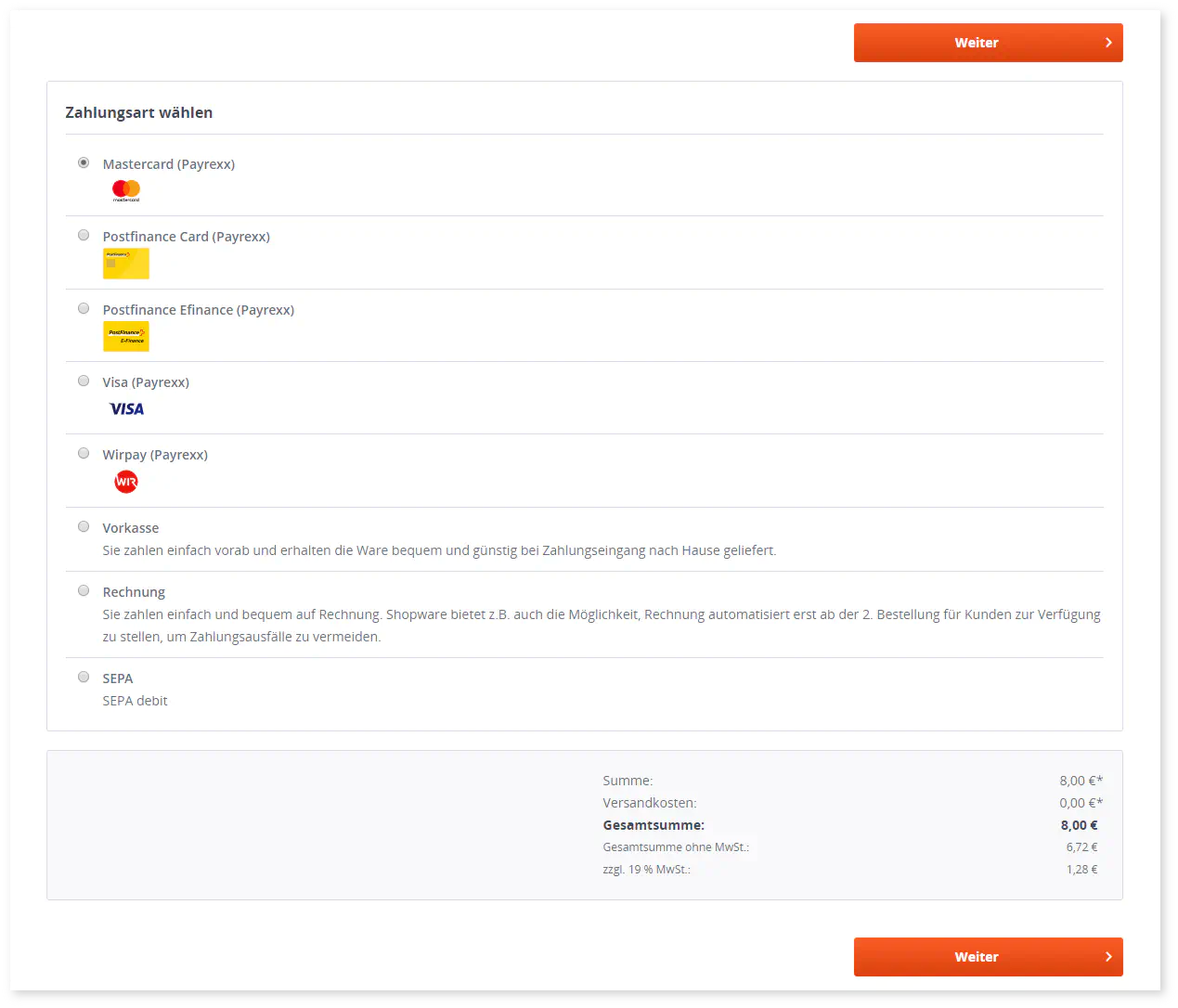 Wählen Sie die bevorzugten Zahlungsarten. Diese können Sie in Ihrem Shopware Account unter «Einstellungen > Zahlungsarten» aktivieren. Die hier gewählten Zahlungsarten sind dann für den Kunden beim Checkout sichtbar.