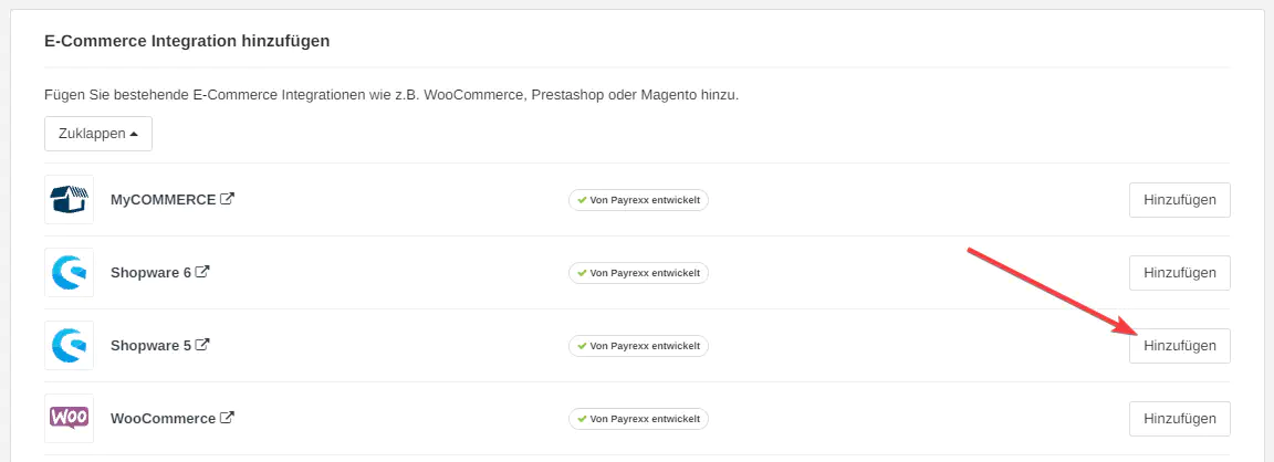 Dort wählen Sie aus der Liste “E-Commerce Integration hinzufügen” Shopware 5 aus und fügen die Integration hinzu.