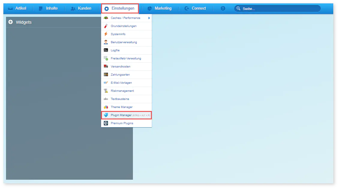 Öffnen Sie den Plugin-Manager in Ihrem Shopware Backend über «Einstellungen > Plugin-Manager» oder mit der Tastenkombination Strg+Alt+P: