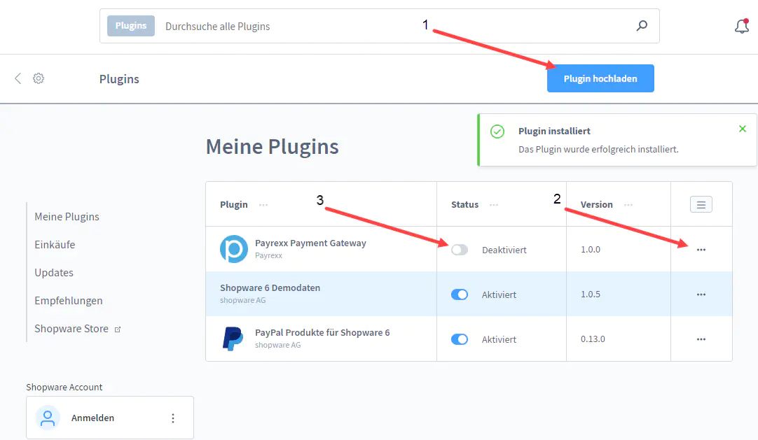 4) Laden Sie das Plugin in Ihrer Administration hoch (1), installieren (2) und aktivieren (3) es anschliessend: