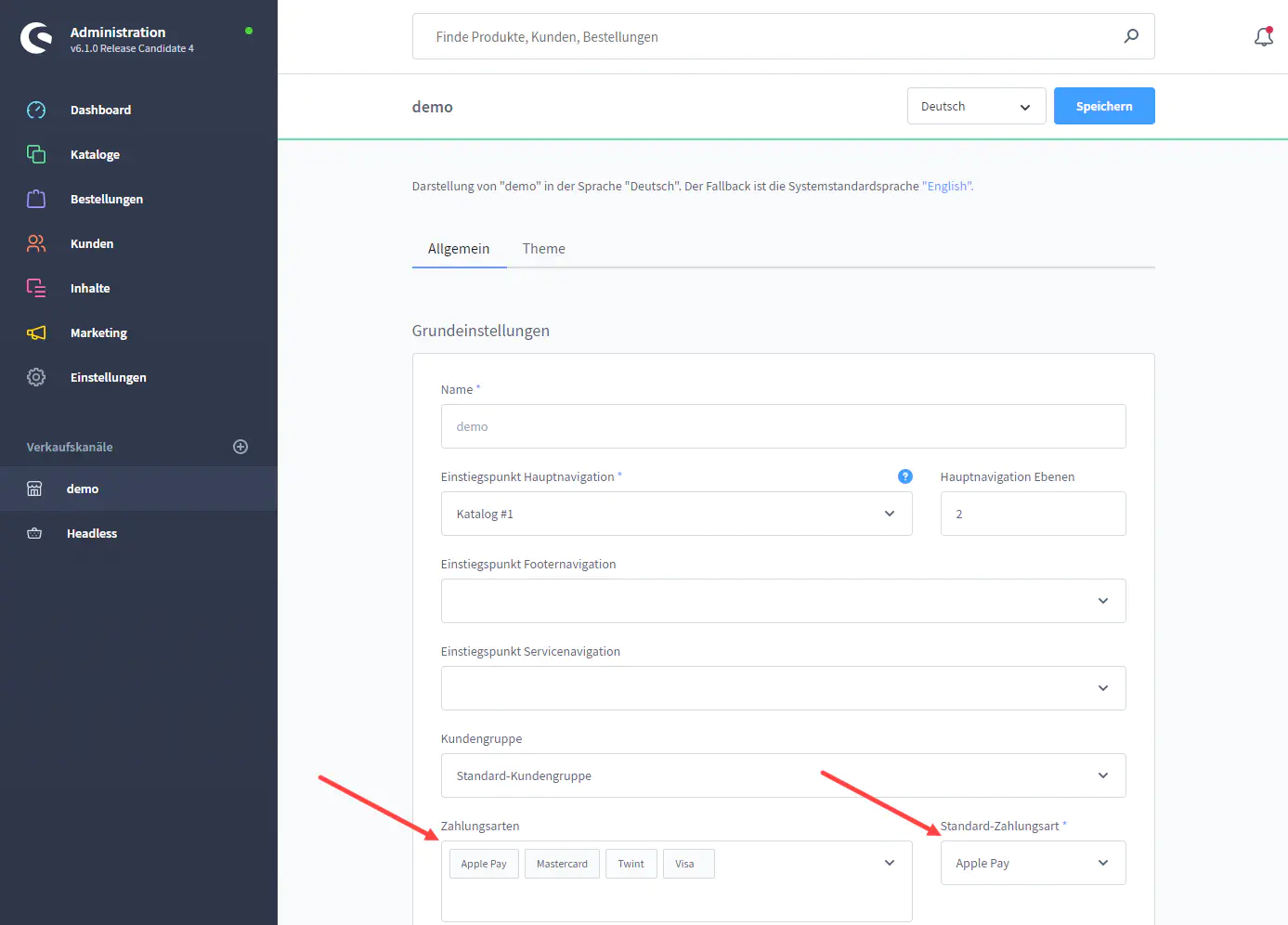 In den Einstellungen der einzelnen Verkaufskanäle können Sie nun die neuen Zahlungsmittel zuweisen: