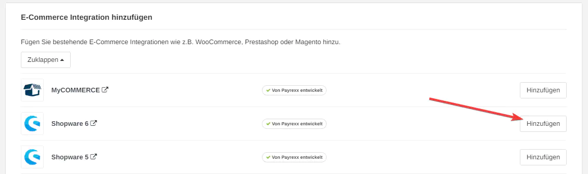 Dort wählen Sie aus der Liste “E-Commerce Integration hinzufügen” Shopware 6 aus und fügen die Integration hinzu.
