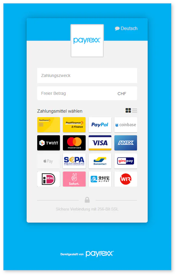 4) Der Kunde wird zum Payrexx Checkout weitergeleitet. Dort kann er mit der gewünschten Zahlungsmethode bezahlen:
