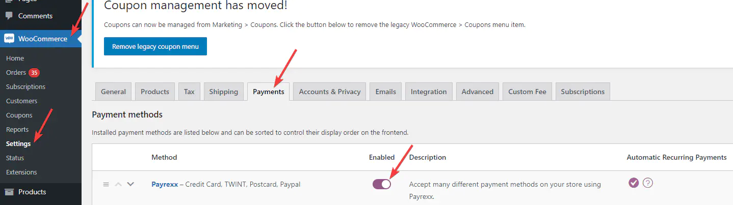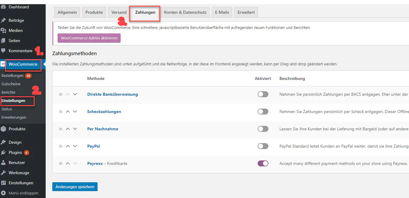 Unter “Woocommerce > Einstellungen > Zahlungen > Payrexx” gelangen Sie zu der Konfiguration.