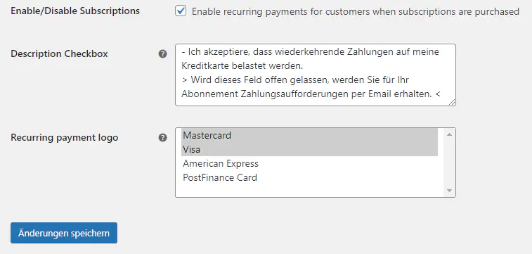 - Wählen Sie die Logos der Zahlungsmethoden welche für wiederholende Zahlungen eingerichtet wurden