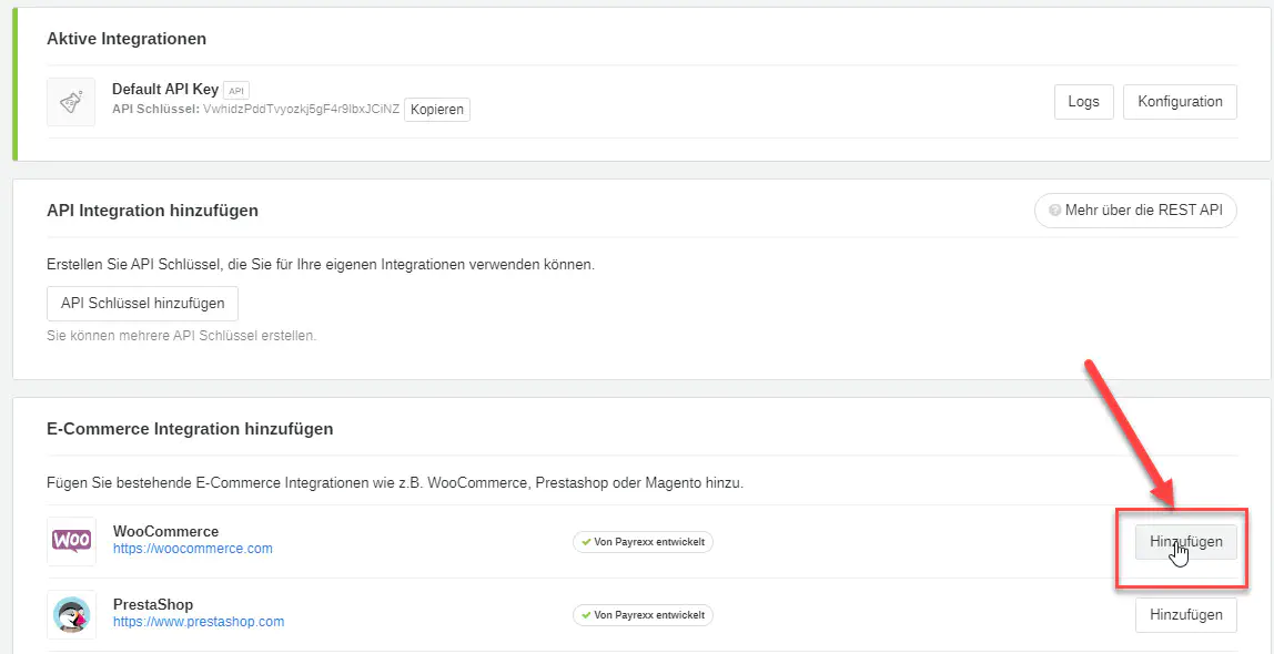 Navigieren Sie in Ihrer Payrexx Administration zu “API & Integration”. Hier können Sie nun WooCommerce hinzufügen. Wählen sie hierzu unter “E-Commerce Integration hinzufügen” WooCommerce aus.