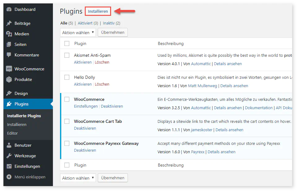 Laden Sie das Plugin kostenlos herunter. Navigieren Sie in Ihrem WordPress Backoffice zu “Plugins” und wählen Sie “installieren”: