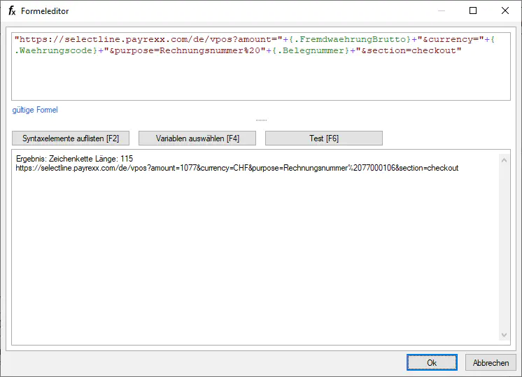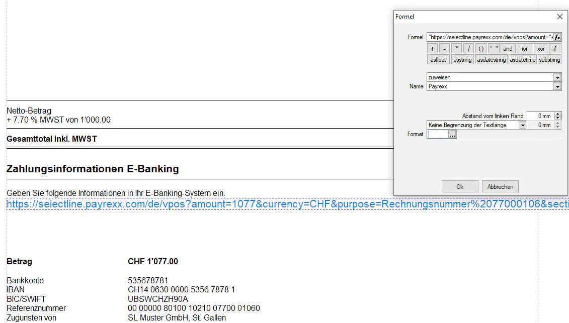 Geben Sie fixe Bestandteile mit Innerhalb Ihres Payrexx Links (z.B: https://selectline.payrexx.com/de/vpos?amount= ) können Sie fixe Bestandteile mitgeben. Dazu müssen Sie die Variablen aus SelectLine mit + an fixen Text knüpfen (z.B. “text”+{Datenfeld}+“text”)