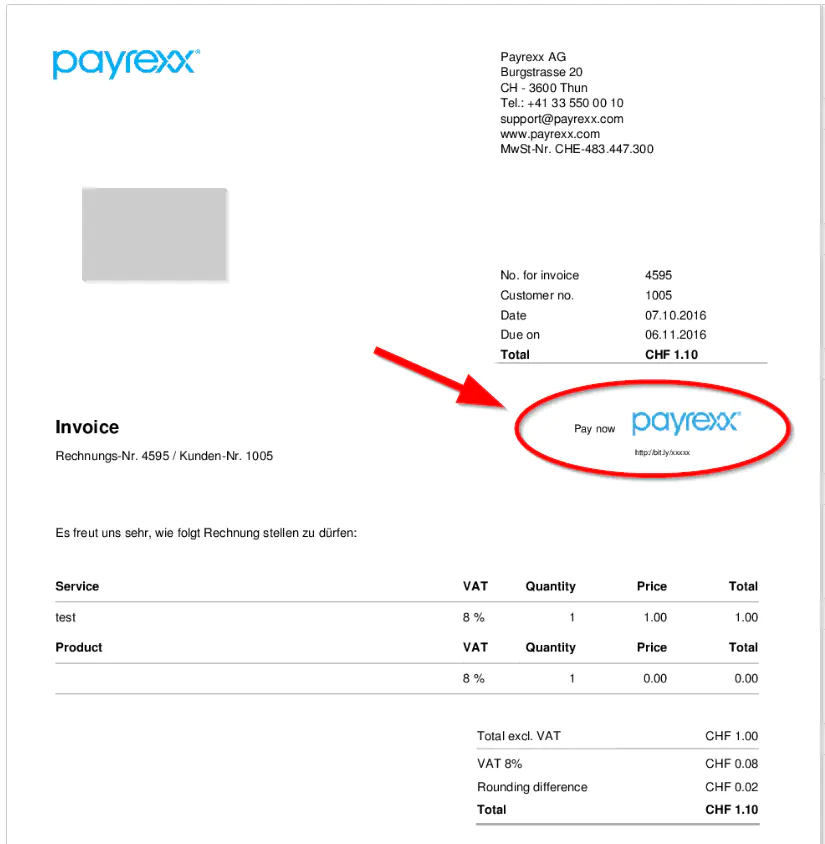 Jetzt erscheint der Payrexx Bezahlungslink auf der Rechnung: