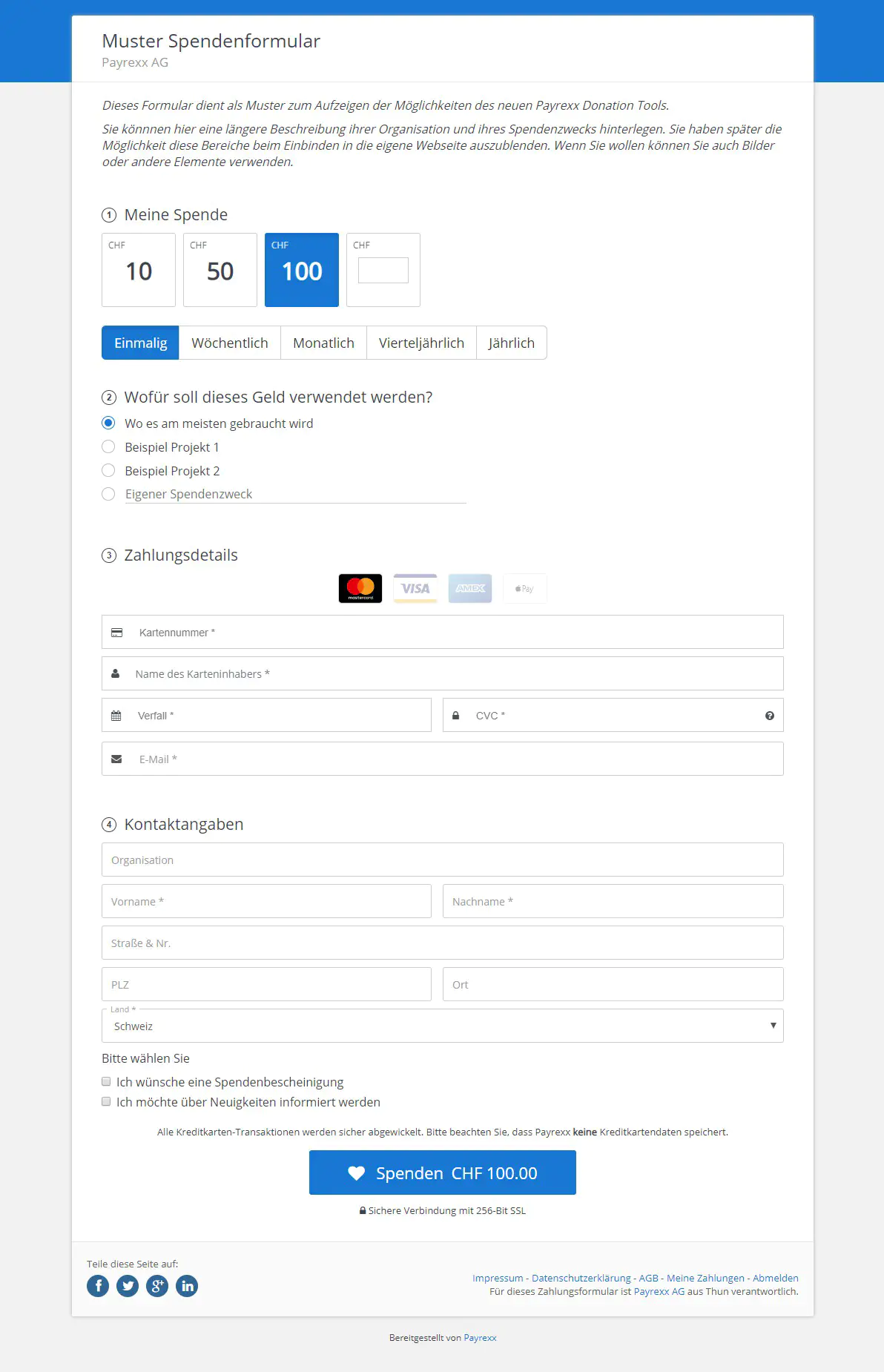 Wichtig: Für regelmässige Spenden wird das E-Mail Feld benötigt. Nur so kann der Spender seine eigene Spende zu einem späteren Zeitpunkt ändern.