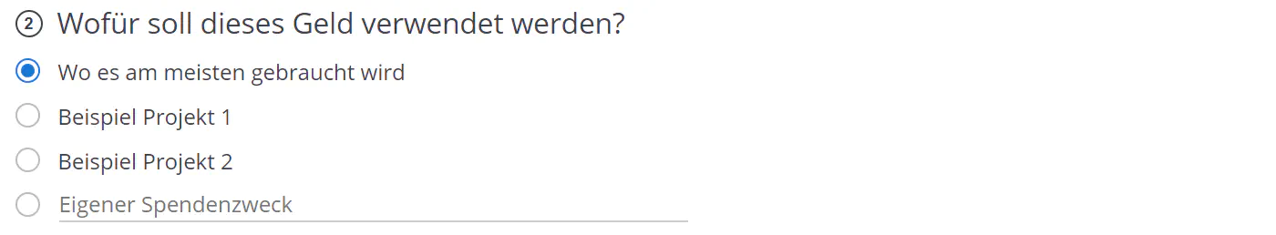 Möchten Sie die Spende für unterschiedliche Zwecke verwenden, können Sie diese hier erfassen. Der Spender wird dann aufgefordert einen Zweck auszuwählen. Sie können dem Spender aber auch die Möglichkeit bieten, selber einen Zweck zu erfassen.