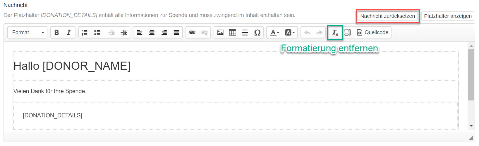 Sie können den Inhalt des E-Mails komplett und in mehreren Sprachen anpassen (mehrere Sprachen können Sie unter «Einstellungen > Grundeinstellungen» aktivieren). Es muss lediglich der Text [DONATION_DETAILS] vorhanden sein (wird mit den Spendeninformationen ersetzt). E-Mails verwenden das ausgewählte Farbprofil.