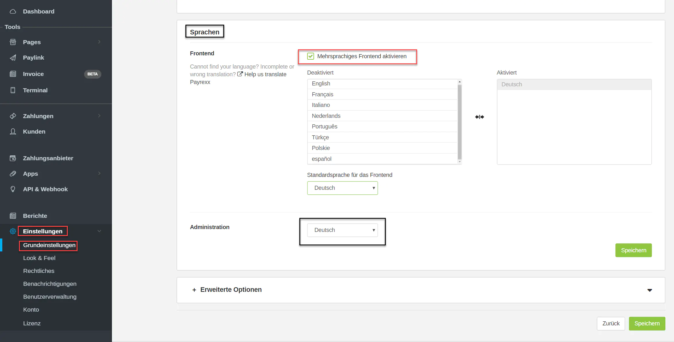 Navigieren Sie zu «Einstellungen > Grundeinstellungen» im Bereich «Sprachen» können Sie nach Wunsch ein mehrsprachiges Frontend aktivieren. Dabei können Sie zwischen insgesamt neun Sprachen auswählen, nämlich Deutsch, Englisch, Französisch, Italienisch, Niederländisch, Spanisch, Portugiesisch, Türkisch und Polnisch.