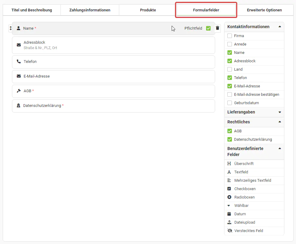 Unter “Pages > Übersicht > Editieren > Formularfelder” haben Sie die Möglichkeit, einzustellen, welche Angaben Sie von ihrem Kunden verlangen. Dementsprechend können Sie selbst bestimmen, welche Felder der Kunde eingeben muss.