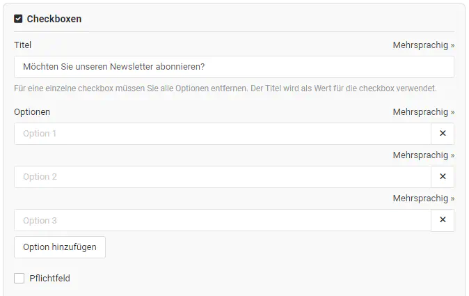 Viele Kunden verwenden die Checkbox, um abzufragen, ob der Kunde ein Newsletter möchte. Es ist dabei wichtig zu verstehen, dass, um die Antworten der Kunden in einem Export zu erhalten, die Checkbox korrekt eingesetzt werden muss.