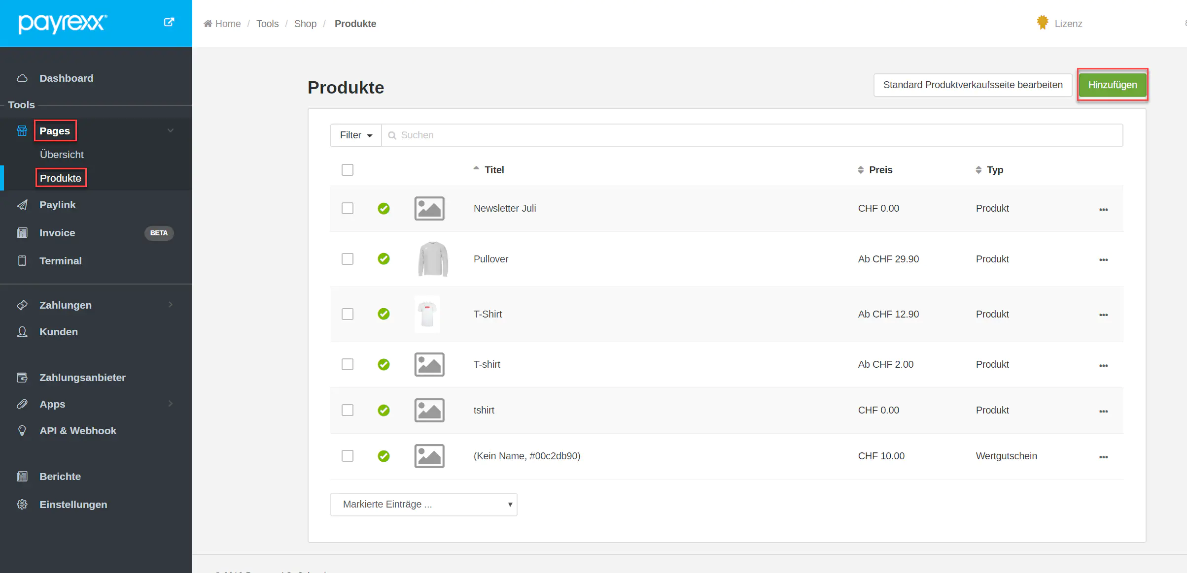 1. Melden Sie sich unter www.payrexx.com in Ihren Payrexx-Account an. Wechseln Sie in Ihrem Backend zu «Pages > Produkte > Hinzufügen».