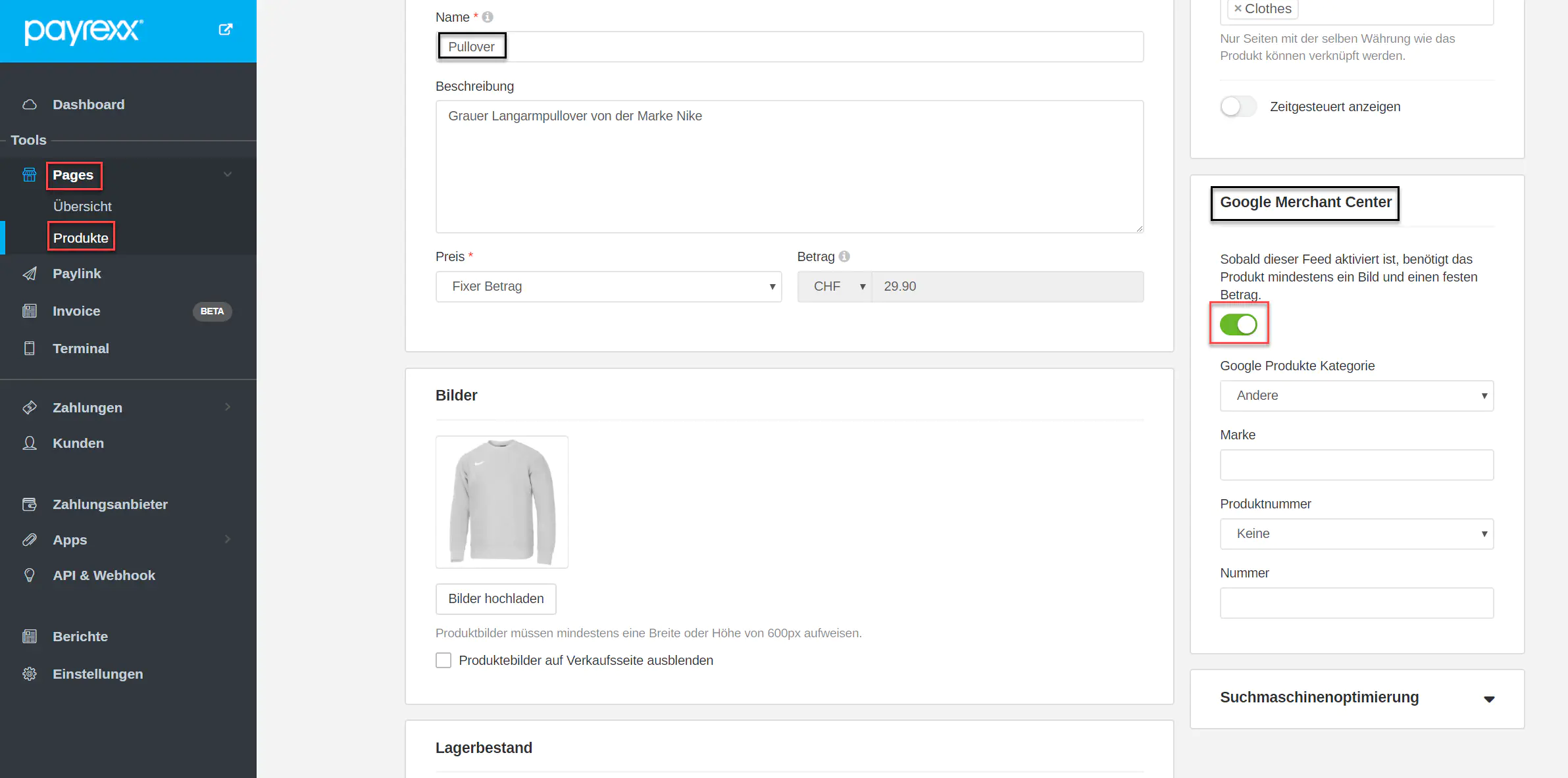 2. Geben Sie Ihre Produktinformationen ein und wählen Sie «Google Merchant Center» ganz rechts. Füllen Sie anschliessend die markierten Felder aus und speichern Sie Ihr Produkt.