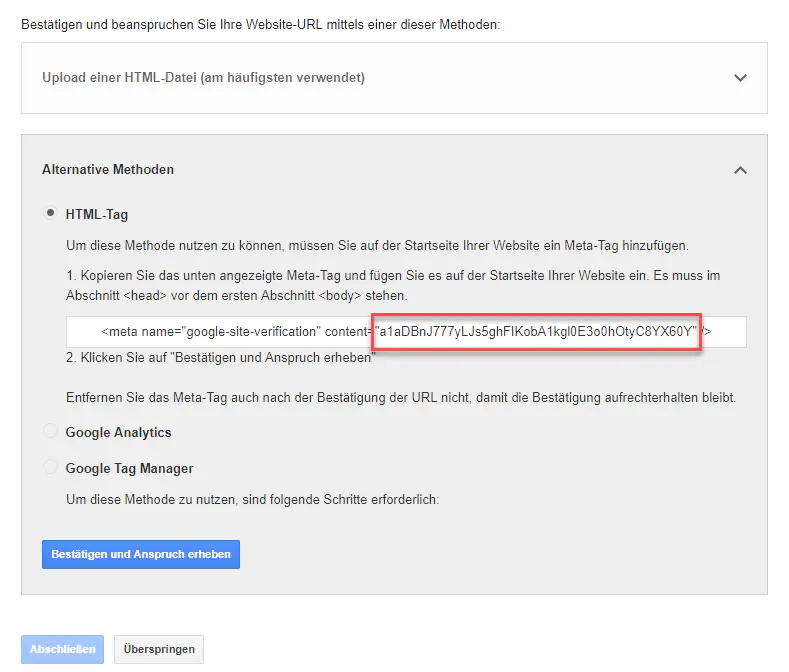 3. Bestätigen Sie Ihre Website, indem Sie «Alternative Methoden» auswählen und anschliessend «HTML-Tag» anklicken. Kopieren Sie den Link zwischen den Anführungszeichen, welcher nach «content=» angezeigt wird.