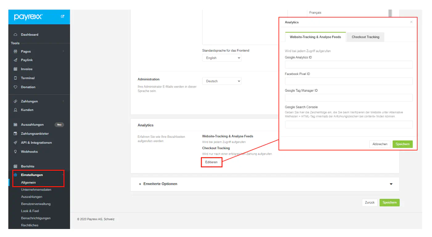 4. Fügen Sie den Link in Ihrem Payrexx Backend unter «Einstellungen > Allgemein > Analytics (Editieren) > Website Tracking and Analyse Feeds» ein.