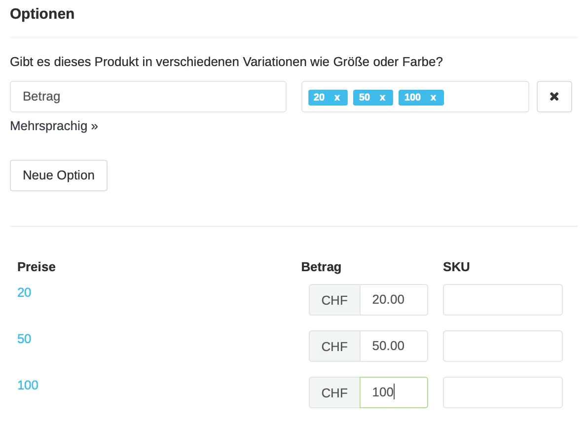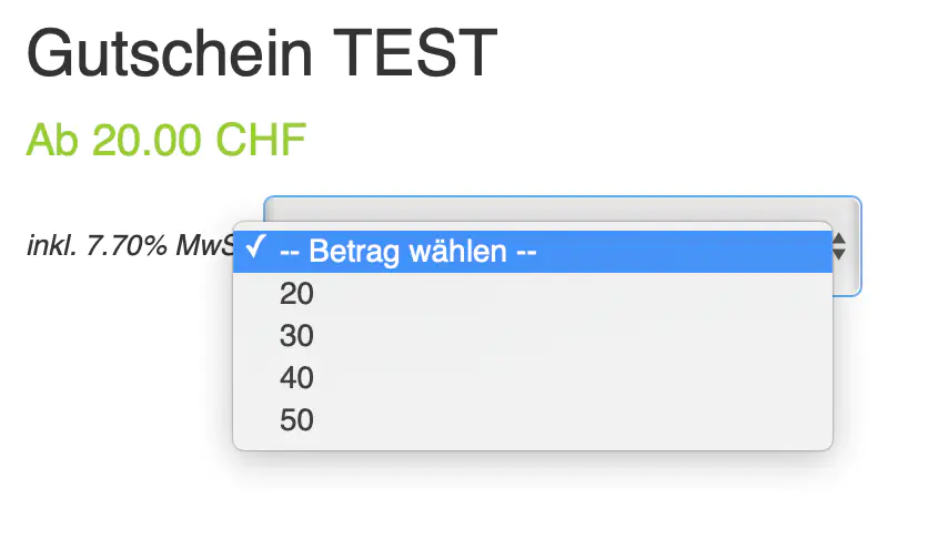 Eine weitere Möglichkeit - anstatt jeden Gutscheinbetrag 20 CHF, 50 CHF etc. einzeln als Produkt zu erfassen - ist nur ein Produkt zu erfassen und dieses in unterschiedlichen Ausführungen (hier unterschiedliche Beträge) anzubieten.