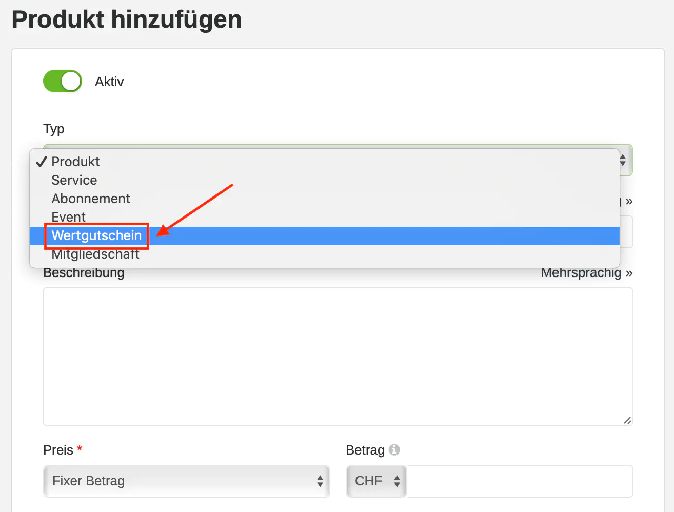 Wählen Sie unter «Typ» die Kategorie «Wertgutschein» aus.