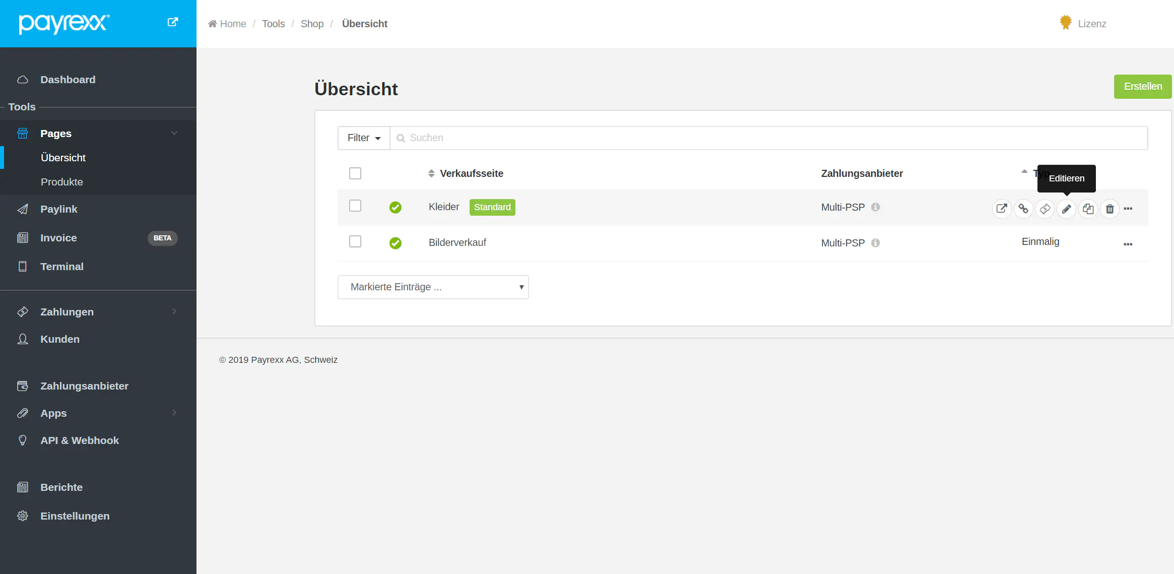 Navigieren Sie in der Payrexx Administration zu «Pages» und wählen Sie rechts «Editieren» aus, und zwar bei demjenigen Shop/Formular, das Sie in Ihre Webseite integrieren möchten: