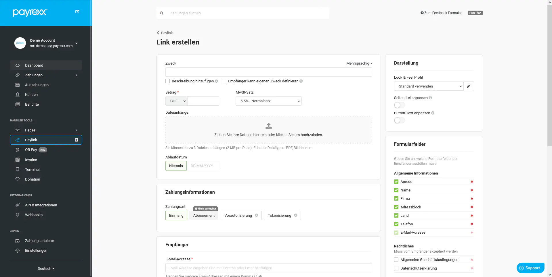 In der vorgefertigten Maske können Sie Einstellungen bezüglich des Zwecks, der Darstellung, des Empfängers/der Empfängerin und der Versandoptionen vornehmen. Optional können Sie den Paylink auch personalisieren, indem Sie bereits bekannte Händlerdaten vor dem Senden einfügen. Standardmässig wird das Standard Look & Feel ausgewählt.