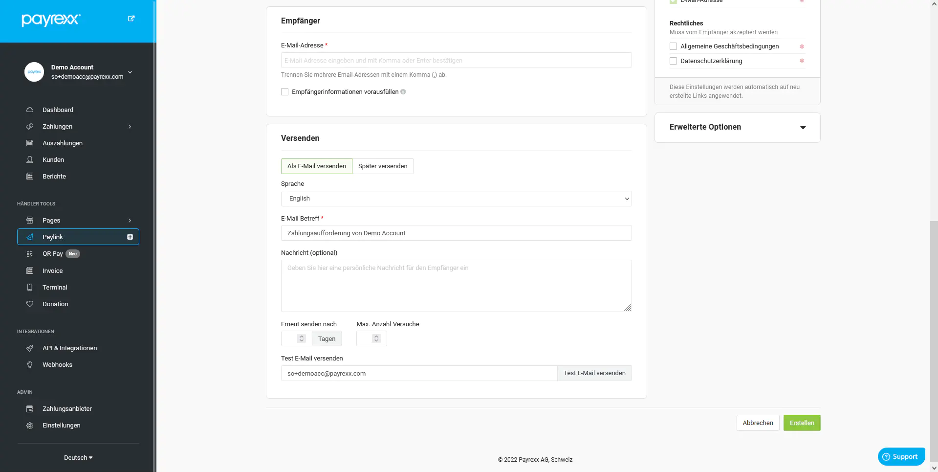Sobald Sie mit Ihrem Paylink zufrieden sind, können Sie auf «Erstellen» klicken. Der Paylink wird erstellt und automatisch an die E-Mail-Adresse des Kunden/der Kundin versendet.