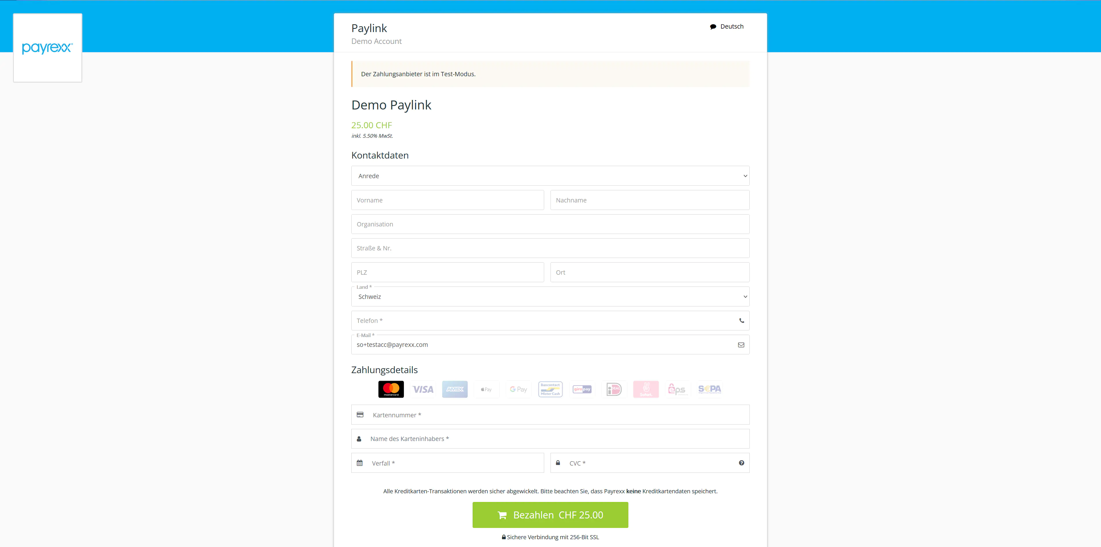 Der Link führt zu einem Zahlungsformular. Die Felder sind bereits ausgefüllt, wenn Sie dies beim Erstellen des Paylinks bereits erledigt haben, sonst sind die Felder leer wie in diesem Beispiel. Weil der Versand als E-Mail gewählt wurde, ist die E-Mail-Adresse des Kunden bereits eingetragen.