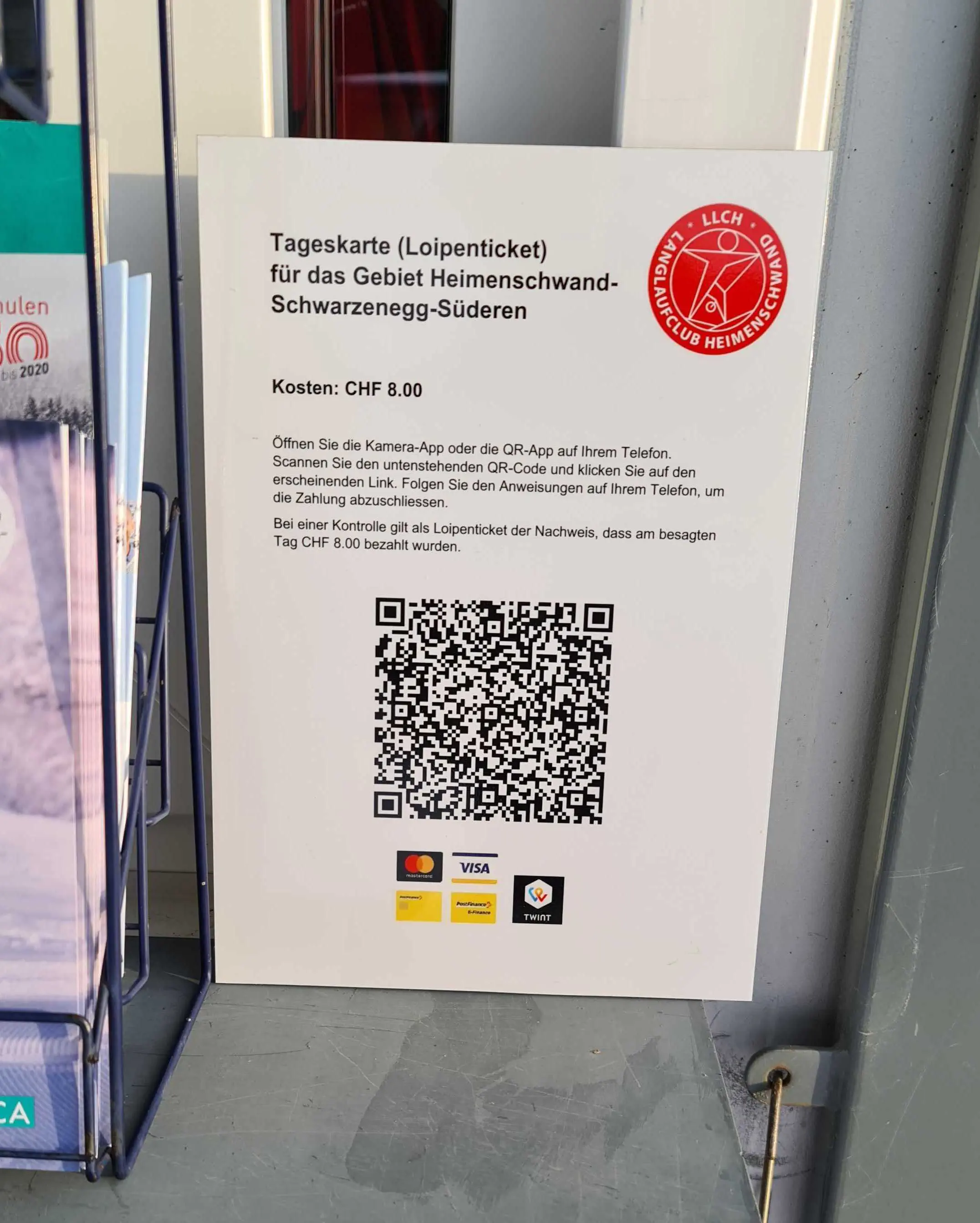 Das QR Pay Tool kann physische Kartenterminals vor Ort ersetzen. Mit dem QR Pay Tool können nur physische Güter erworben werden und es ist eine Lösungsmöglichkeit, wenn Besucher kein Bargeld mit sich tragen. Es folgt ein Beispiel von der Loipe in Heimenschwand.
