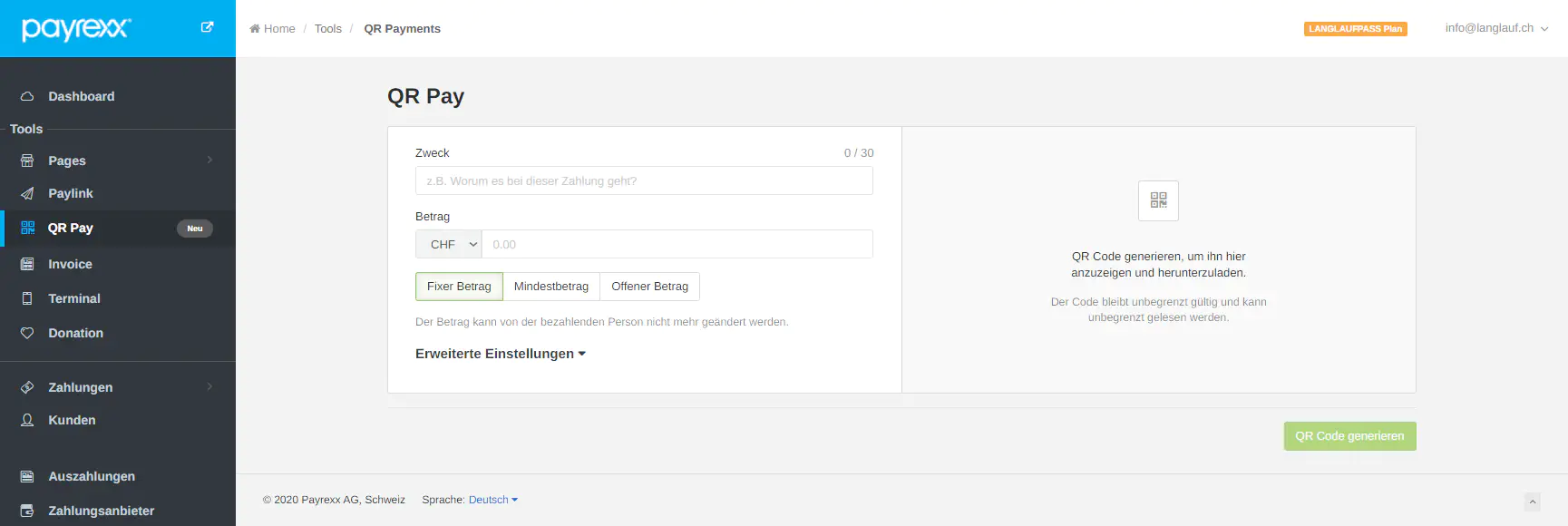 Navigieren Sie nun zum QR Pay Tool und erstellen Sie Ihren ersten QR-Code. Wählen Sie einen sprechenden Titel und geben Sie einen Betrag an. Nach der Angabe dieser Daten können Sie den QR-Code mittels des «QR-Code generieren» Knopfes erstellen.