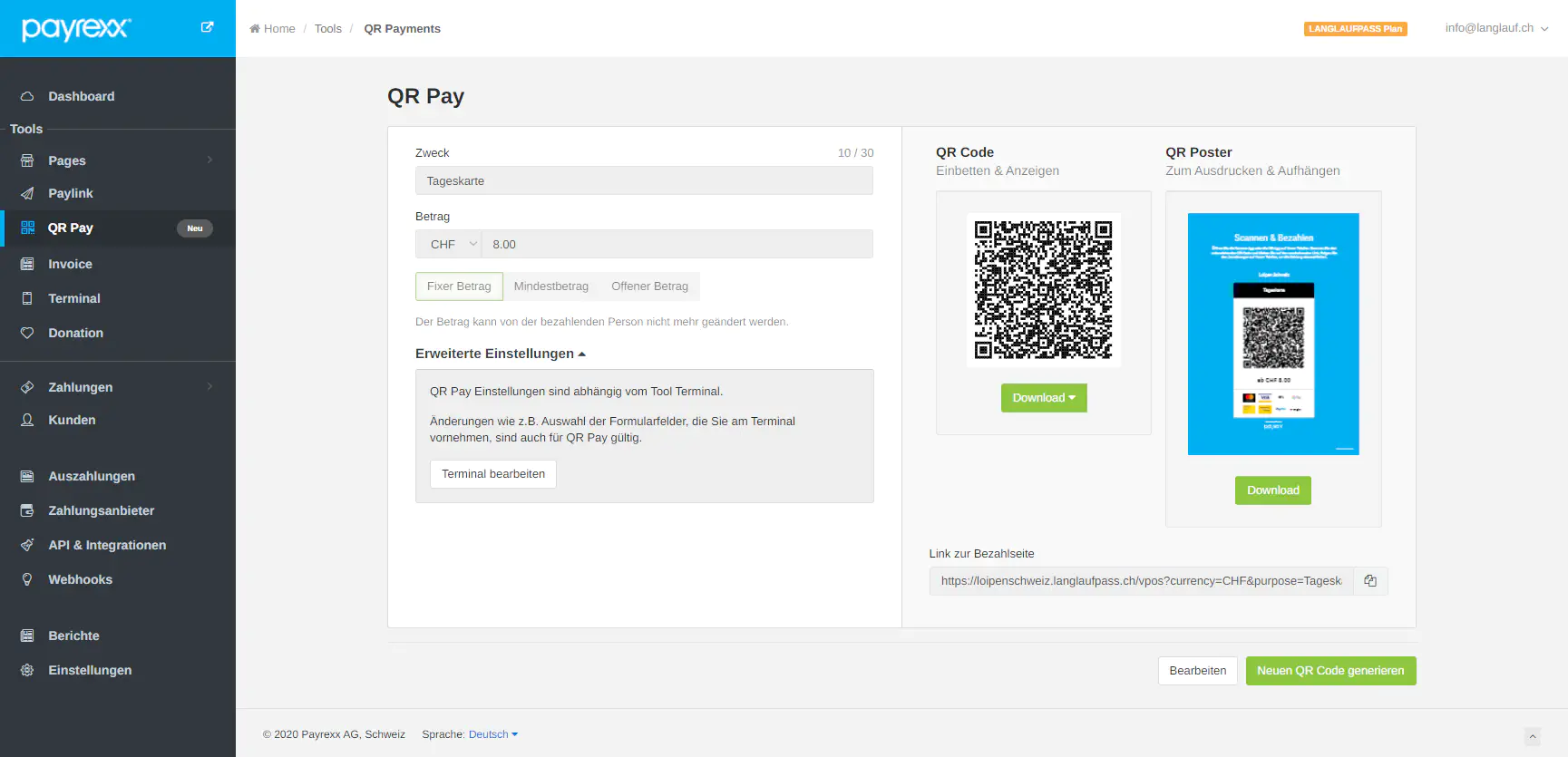 Ein QR-Code und ein PDF-Poster im Format A4 werden generiert. Hier wurde nun der Titel «Tageskarte» und der Betrag 8 CHF gewählt. Durch einen Klick auf die Schaltfläche «Herunterladen» kann der QR-Code sowie das Poster im gewünschten Format abgelegt werden.