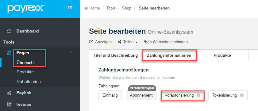 Nach der Registrierung eines Zahlungsanbieters, welcher Vorautorisierung unterstützt, können Sie die Zahlart «Vorautorisierung» ganz einfach in unseren Tools auswählen.