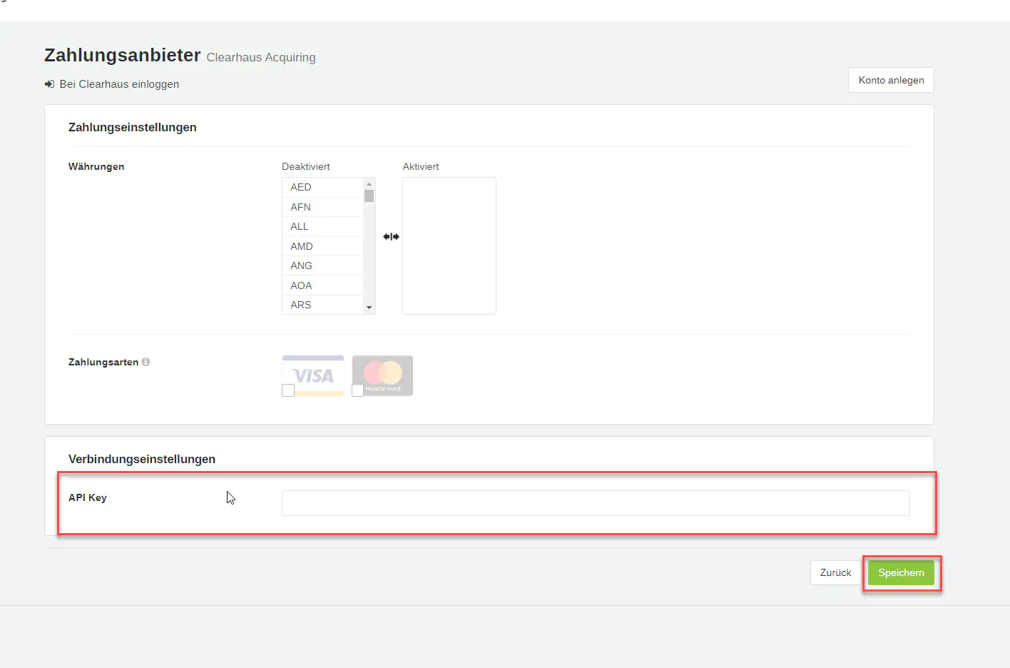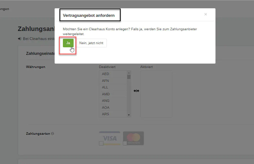 Der Zahlungsanbieter Clearhaus Acquiring ist eingerichtet.