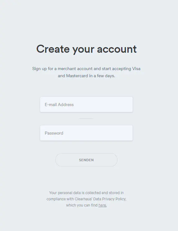 - Sie werden zur Seite von Clearhaus weitergeleitet. Dort können Sie einen Account kreieren. Geben Sie Ihre E-Mail Adresse an und wählen Sie ein Passwort.